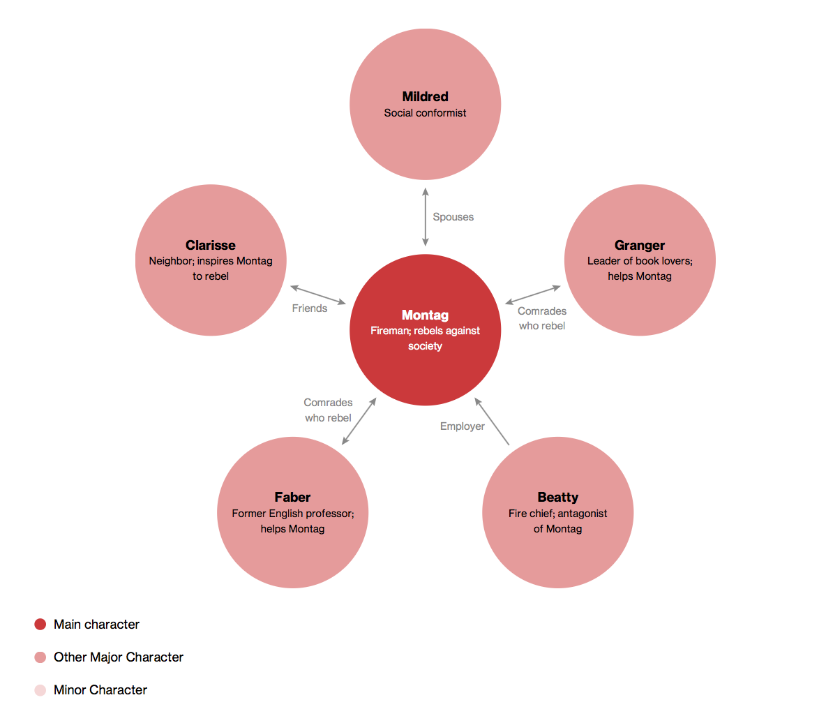 A fireman and the book's protagonist. As the novel opens, Montag takes pride in burning books and the homes of people who illegally own books. After meeting Clarisse McClellan, however, he begins to face his growing dissatisfaction with his life, his job, his marriage, and the pleasure-seeking, unthinking culture in which he lives. In fact, he has been secretly hoarding books, without actually reading them. After Clarisse's death, he eventually begins to read the books. From that point on, there's no turning back, and Montag begins to take action against his oppressive society.